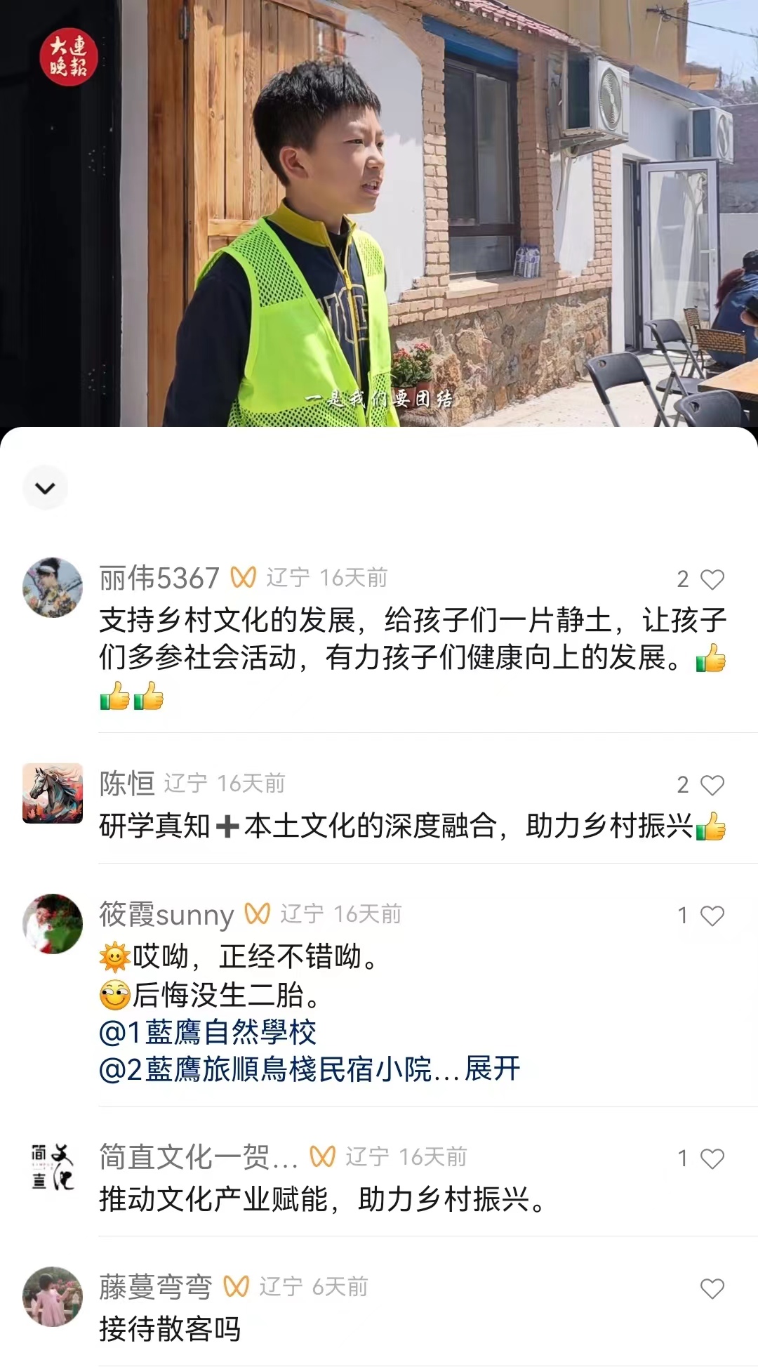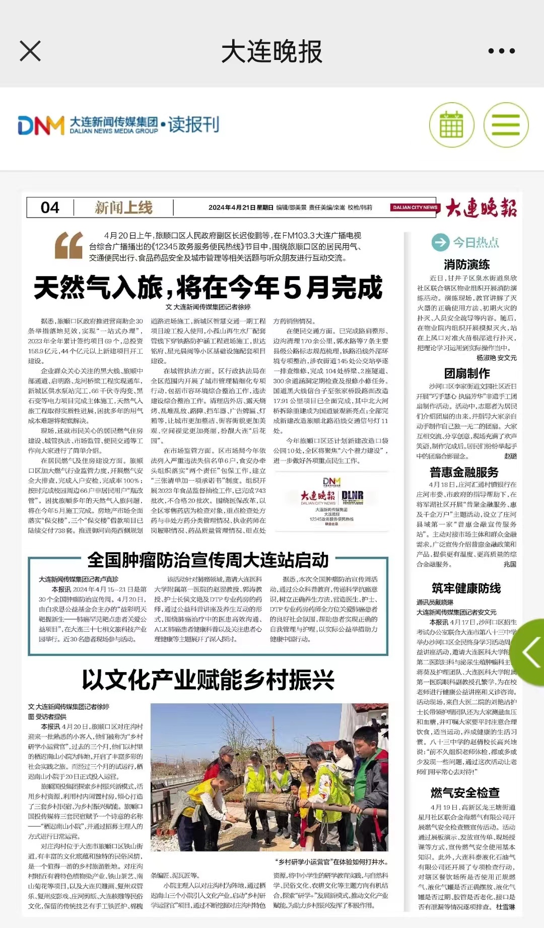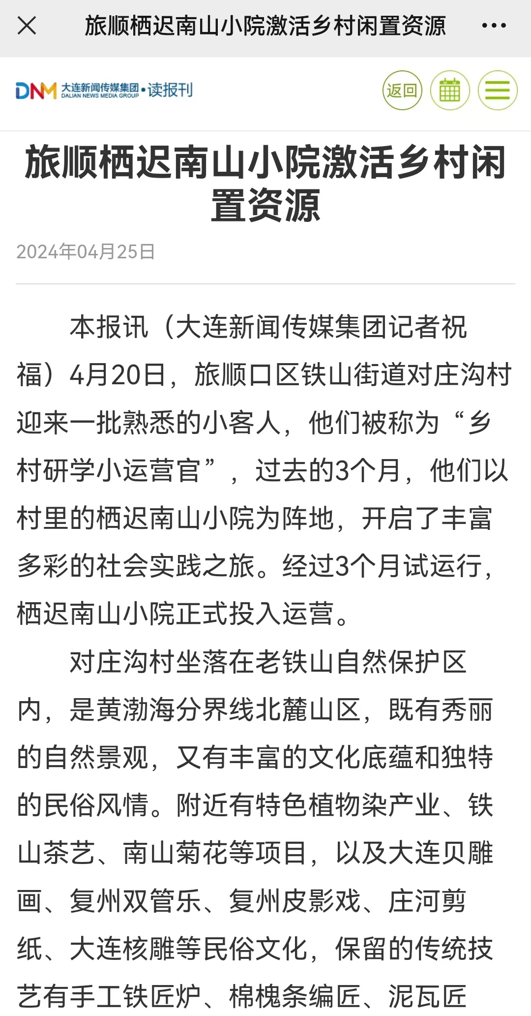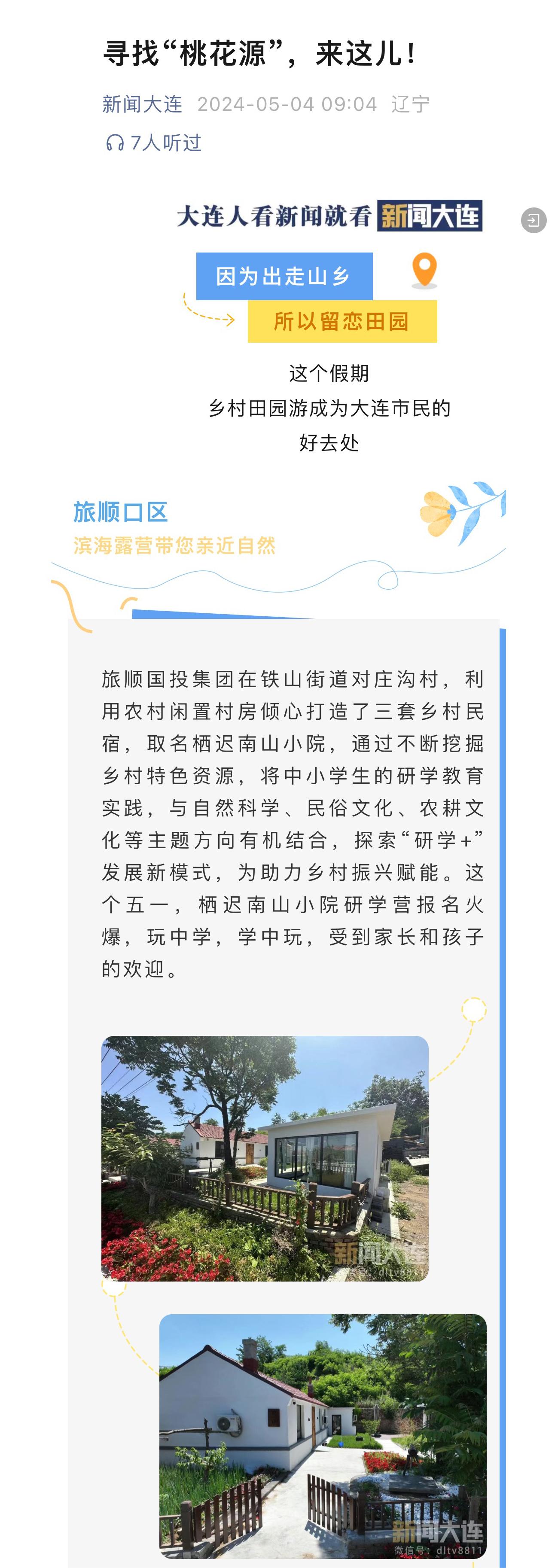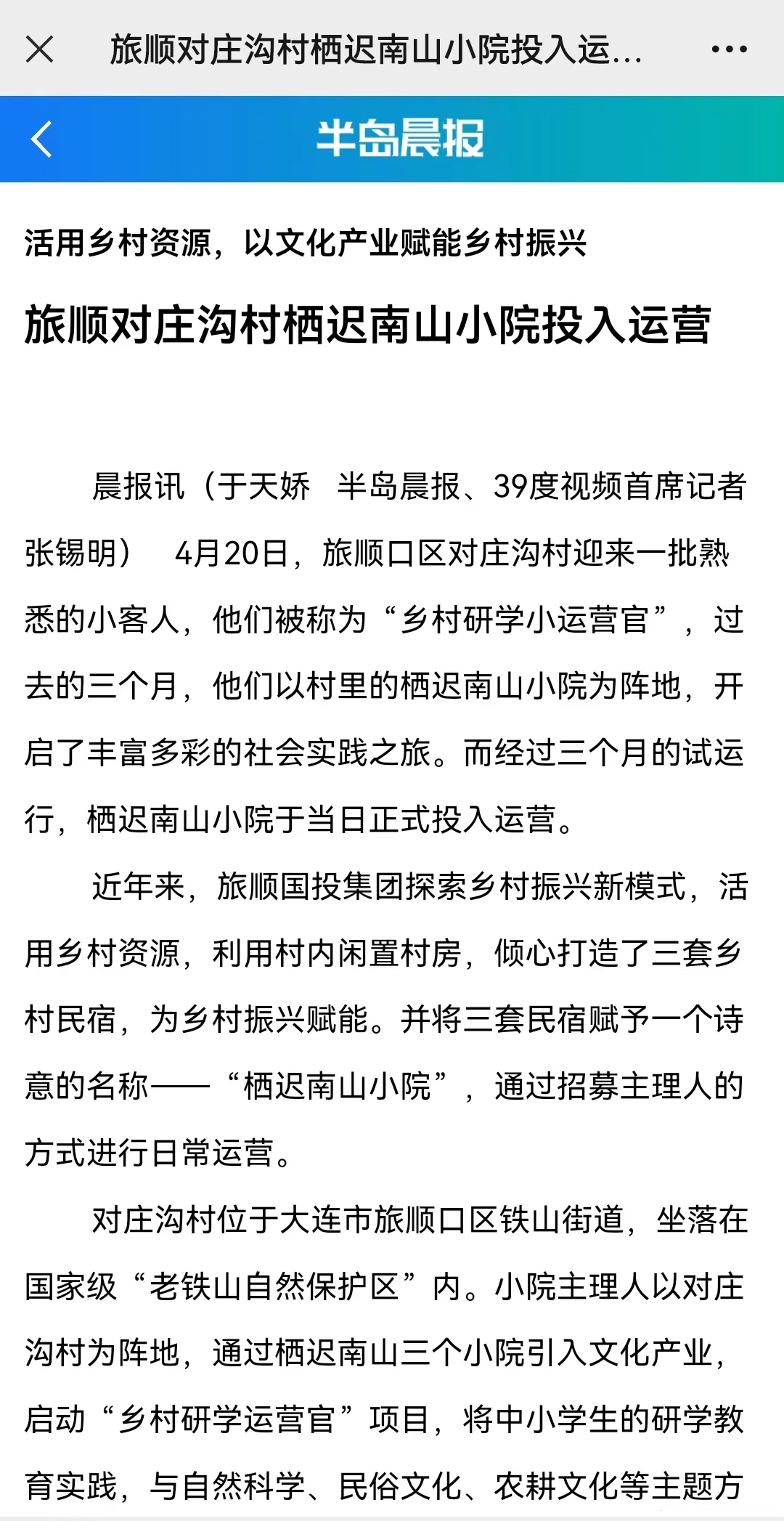 大连晚报对旅顺口区对庄沟村栖迟南山小院进行了深度的采访与报道,题为“以文化产业赋能乡村振兴”。