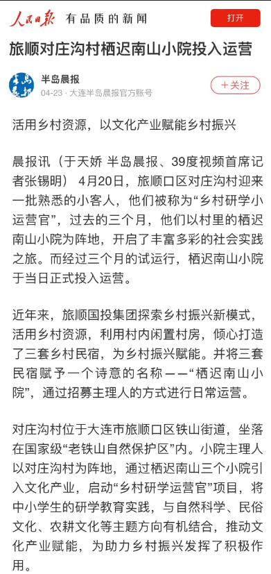 前不久,旅顺国投集团官方公众号发布了《活用乡村资源 以文化产业赋能乡村振兴 | 旅顺口区对庄沟村栖迟南山小院正式投入运营》,消息发布后引发多方媒体关注。