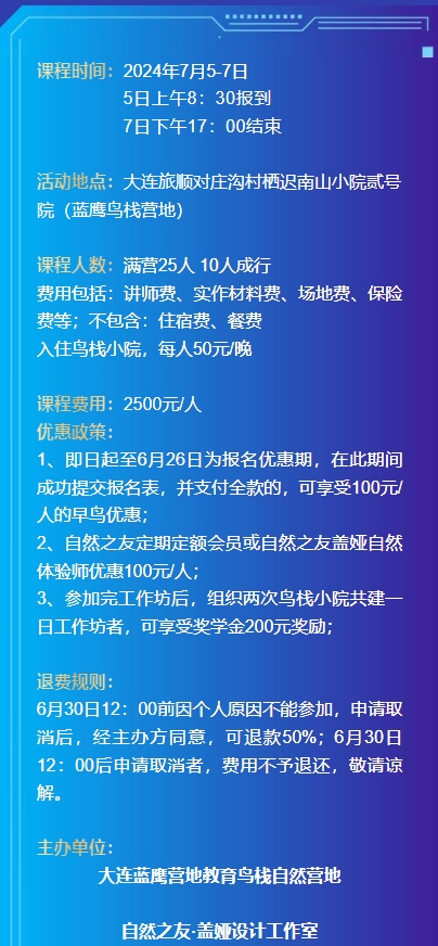 特邀盖娅设计泰山老师从北京来连,带我们进行生态的户外教室营造工坊,不需跑远路喽,家门口就可以学习啦!