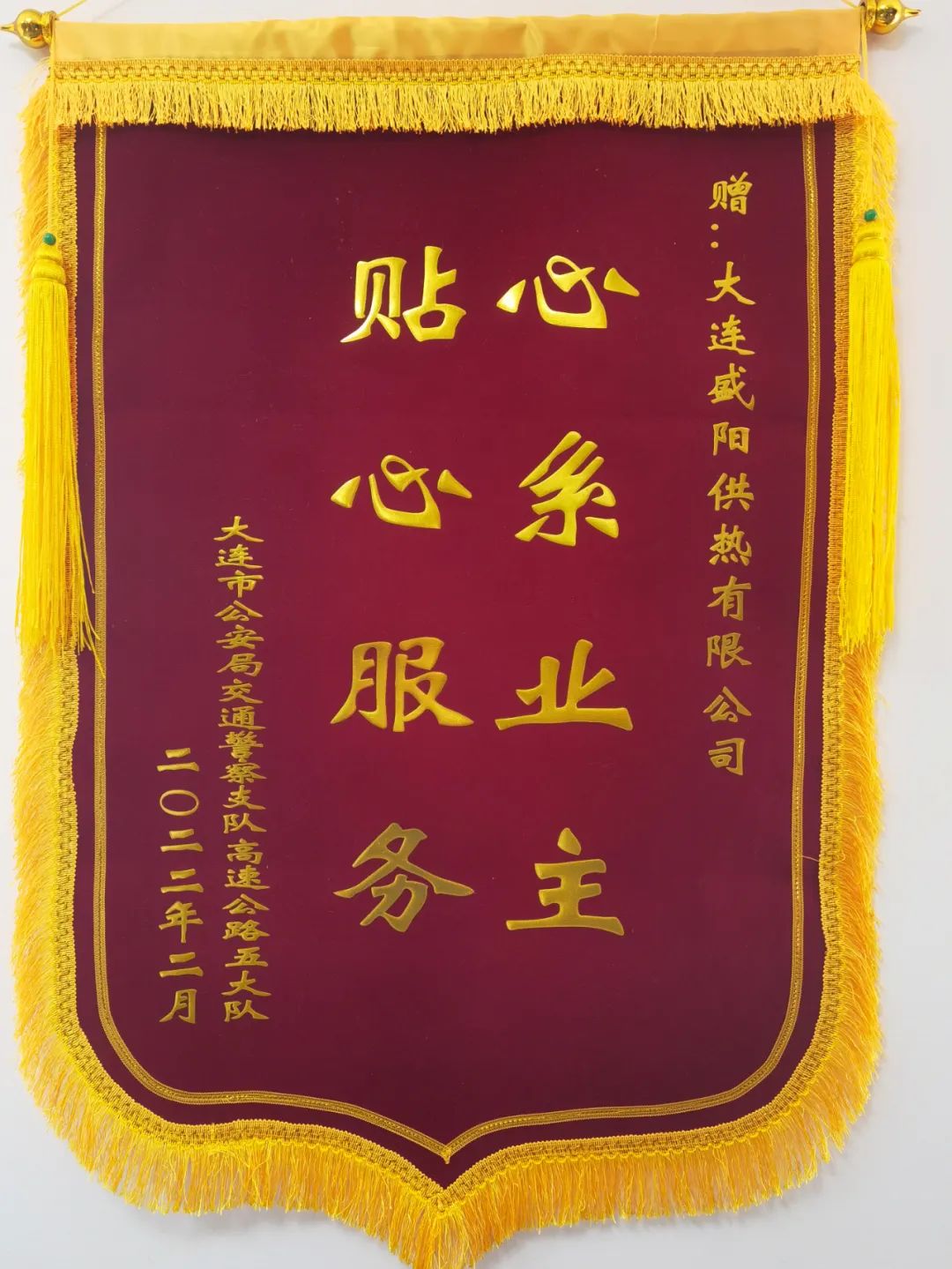 现在位置:首页>新闻中心2月21日上午,旅顺国投集团城市运营板块所属的盛阳供热有限公司,迎来了一群特殊的客人,他们是来自大连市公安局交通警察支队高速公路五大队的汤队长和政委,此行的目的是向为干警提供供暖保障的盛阳供热公司送来感谢锦旗。